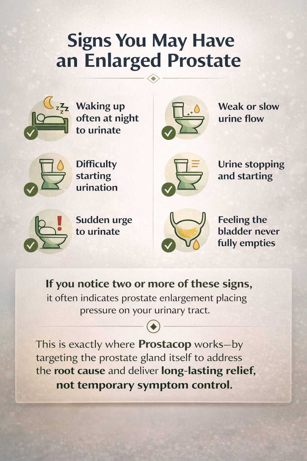 A person may have prostate enlargement if they experience symptoms such as frequent urination (especially at night), weak or slow urine flow, difficulty starting urination, stopping and starting while urinating, a feeling that the bladder does not fully empty, or sudden urgent urges to urinate.