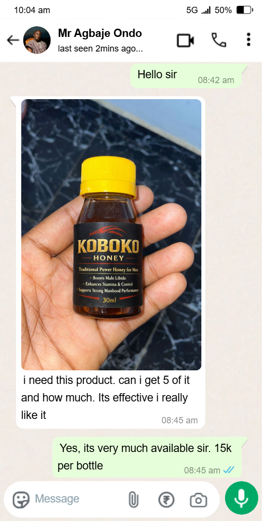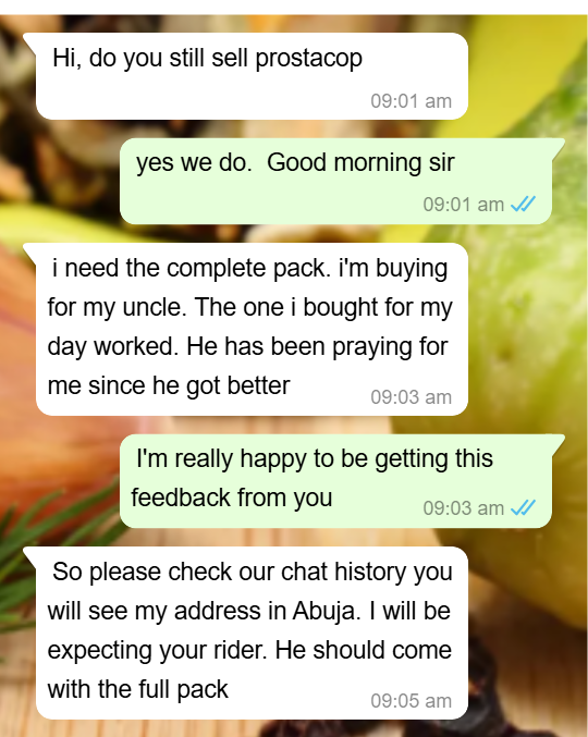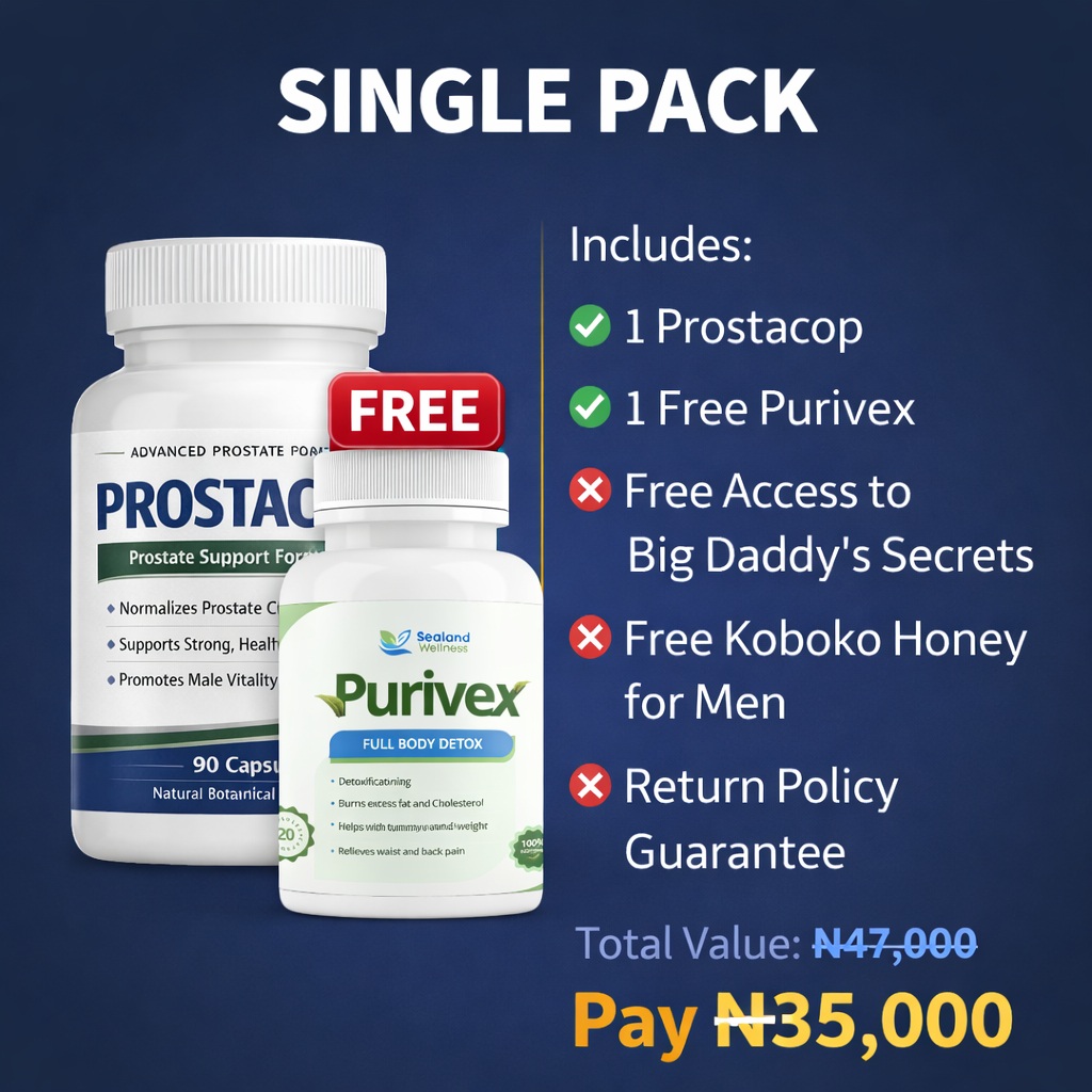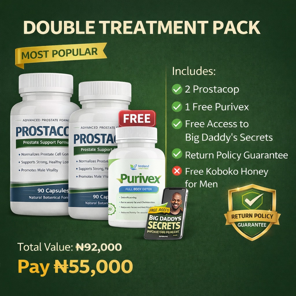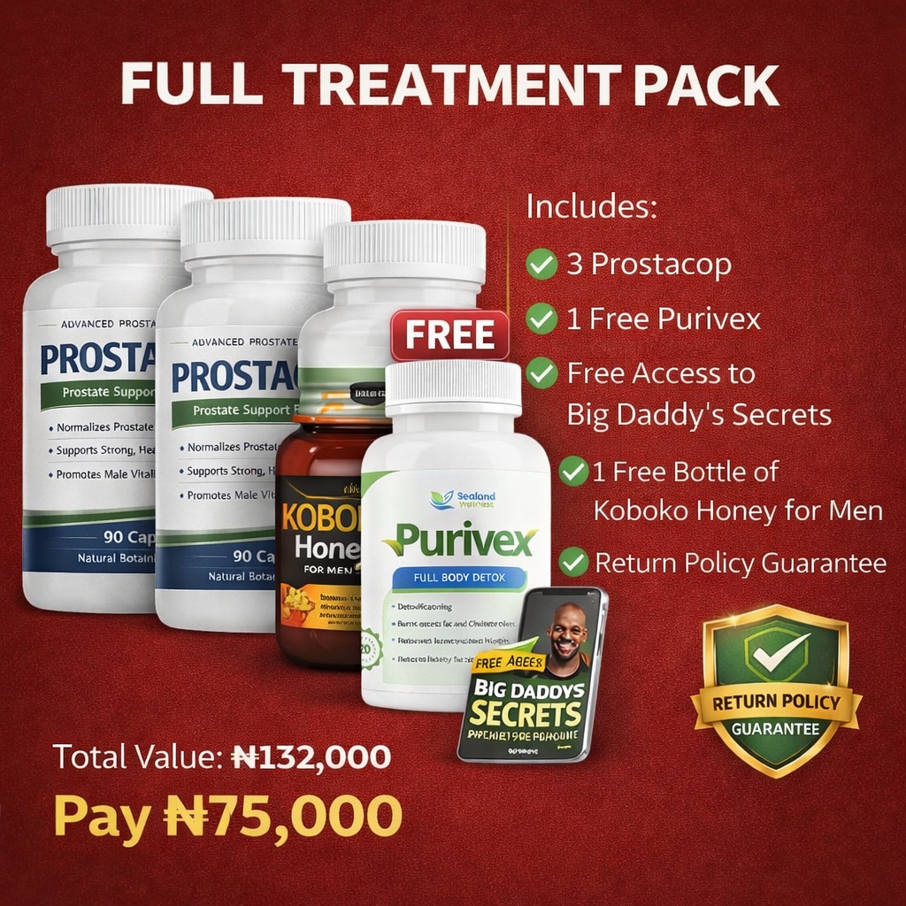 When you order the Full Pack of Prostacop treatment plan, it will also be delivered with 1 bottle of Koboko honey worth N15,000, a ready for use, honey based powerful remedy that boosts bedroom performance for men of all ages. You will be getting it absolutely free.