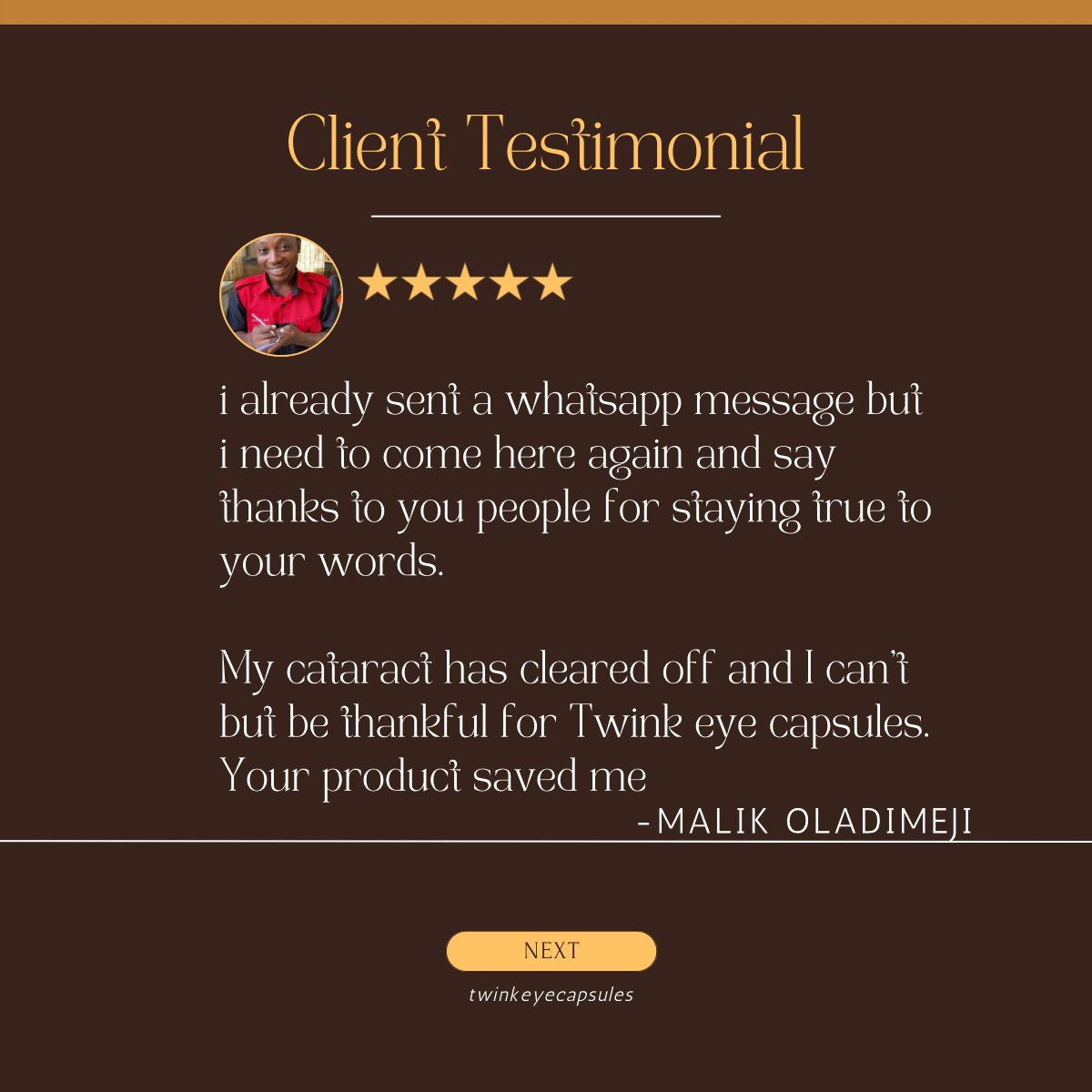Over 5400 Nigerians have used this product to correct their vision so far. We  have an accurate record of everyone that has ever laid hands on Twink through this channel and we always anticipate the testimonials. Here are even more from the many testimonies we've received so far.
