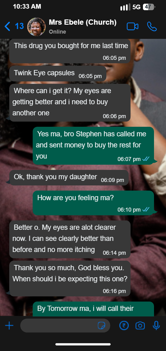 I just want to say a big thank you for this amazing product. At 68, I was struggling with my eyesight—reading my Bible was difficult, and I could barely recognize faces from a distance. My cataracts were getting worse, and I feared I would eventually lose my vision. Also, Surgery was too expensive, so I decided to try Twink Eye Capsules as my last hope after trying several others.