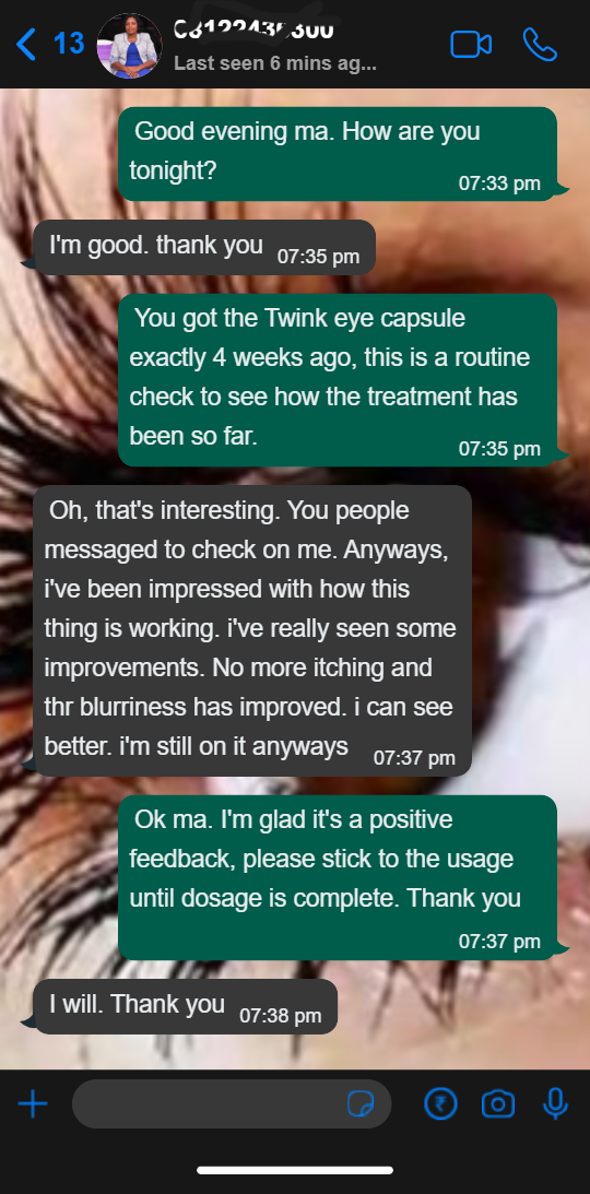 I can’t thank you enough! For years, my eyesight kept getting worse—reading was a struggle, and night driving was not possible. I almost lost my vision completely. But after using Twink Eye Capsules for a few weeks, my eyes felt a lot relieved, I could read better, and driving at night became much easier. Two months so far, my vision is clearer, and my life is better for it. Twink is truly a lifesaver!